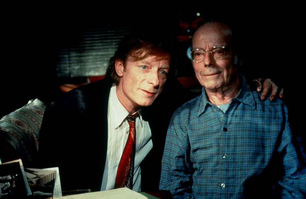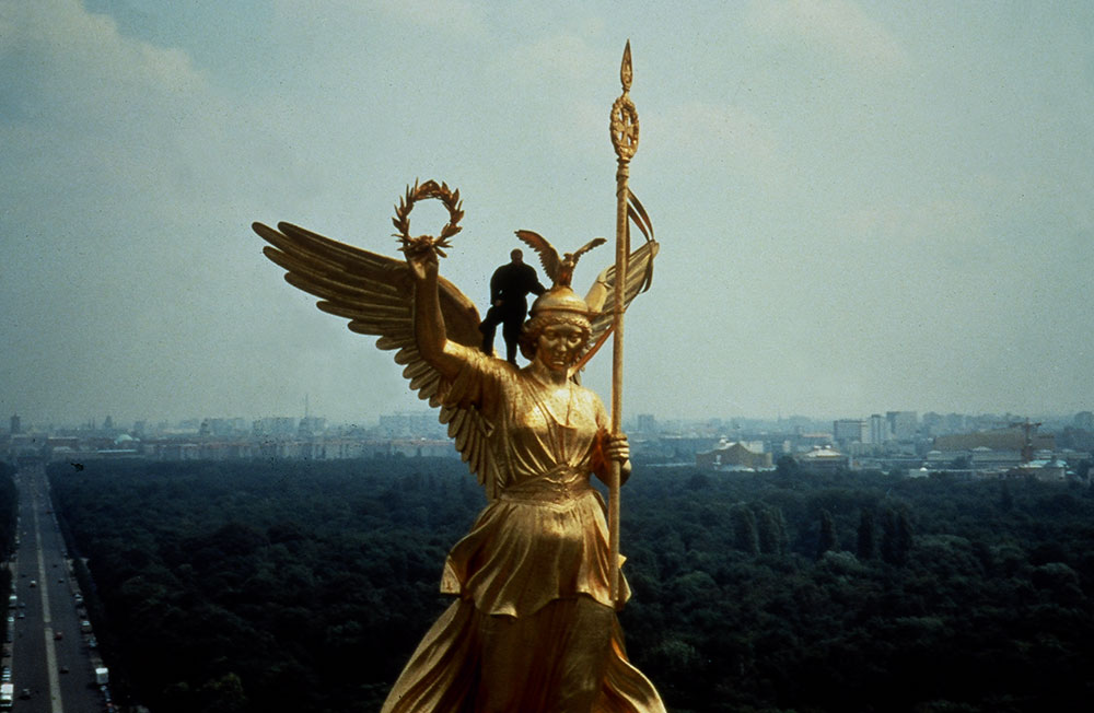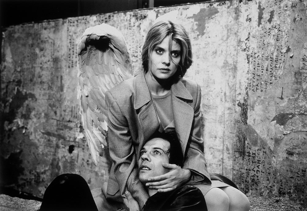 3 years after the fall of the Berlin Wall Wenders made a follow up to “Wings of Desire”. Berlin had become a different city and it appeared to him that he could tell this change best with the same characters. And so Damiel (Bruno Ganz) is now married to Marion (Solveig Dommartin), runs the pizzeria “Da Angelo” and the two have a child. The solitarily remaining angel Cassiel (Otto Sander) is more and more dissatisfied with his destiny as a mere observer of human life and finally decides to take the great leap. As Karl Engel he soon gets into a dubious milieu and finds himself as the assistant of the German American Baker (Horst Buchholz), who makes his money with shady arms deals and sends porno films east in exchange for weapons. Furthermore Cassiel alias Karl Engel meets “Emit Flesti” (Willem Dafoe), a Mephisto like character, who seems to embody “time itself”. And then there is Raphaela (Nastassja Kinski), his guarding angel companion who worriedly observes his development. Cassiel’s adventure turns into a “thriller” when he decides to put a stop to Baker’s game. With the help of Marion’s Circus friends he brakes into the weapons stash underneath the old Tempelhof airport and lets the Kalashnikov crates float into the Spree river. Peter Falk and detective Phillip Winter (Rüdiger Vogler) are also in on it again. Heinz Rühmann can be seen in his last role. Mikhail Gorbachev and Lou Reed appear as guests. He never gathered a more improbable cast says Wenders.